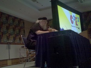 6. Дотракийский язык: Мартин пытается выяснить, получится ли у него вписать немного Дотракийского в романы, но здесь есть некоторая юридическая неясность, так как права на новый язык принадлежат HBO. Писатель говорит, что везде сталкивается с политикой — вот и здесь, некий лингвист отказался от работы над Дотракийским языком, потому, что представитель HBO в этом деле принадлежит к определённой группе, которая ему не по душе.