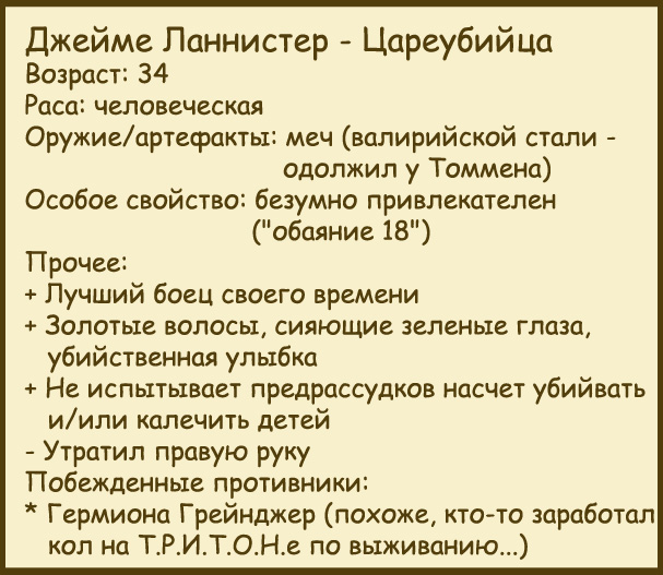 В предыдущих матчах Джейме одолел Гермиону Грейнджер, Ктулху и дракона из цикла Наоми Новик «Отважный».